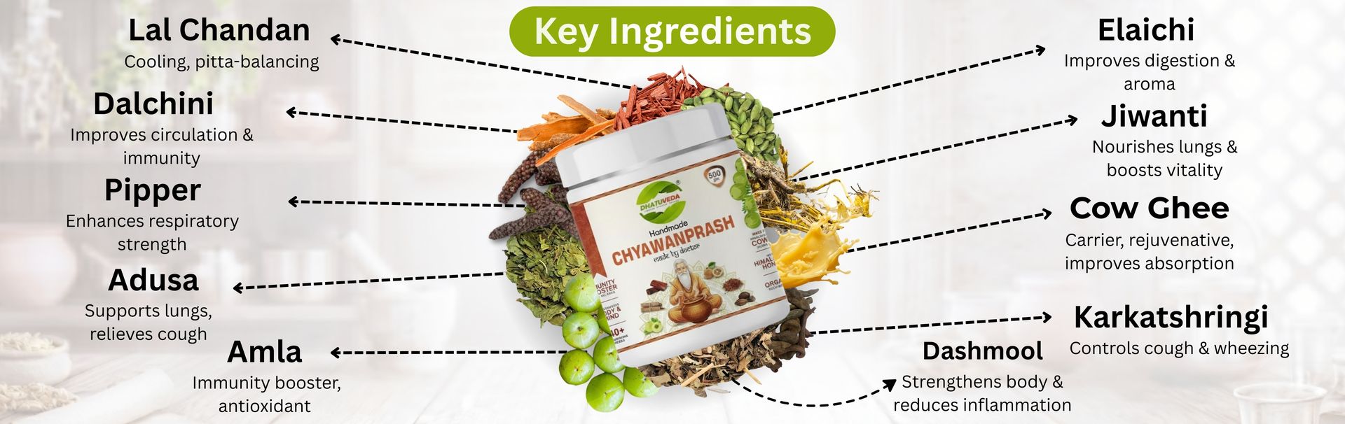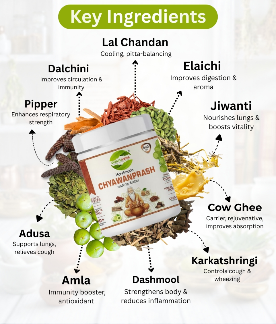 Dhatuveda Chyawanprash is enriched with Amla, a powerful natural source of antioxidants and Vitamin C that helps support immunity and overall vitality. Pippali aids digestion and supports respiratory wellness, while Elaichi helps improve digestion and enhances taste and freshness. Vanshlochan contributes to respiratory comfort and supports strength, making this classical blend ideal for daily wellness and rejuvenation.