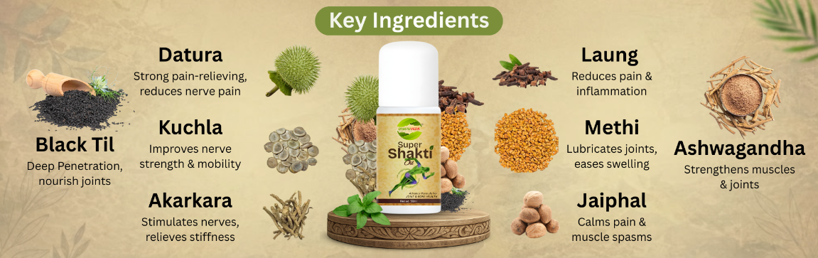 Dhatuveda Super Shakti Oil is enriched with a powerful blend of traditional Ayurvedic herbs including Datura (Dhatura) to support joint and muscle comfort, Laung (Clove) for its natural warming and soothing properties, Ashwagandha to nourish and strengthen muscles, Methi (Fenugreek) to promote flexibility and joint wellness, Purified Kuchla (Nux Vomica) for classical muscular and nerve support, Jaiphal (Nutmeg) to ease stiffness and enhance relaxation, Akarkara to stimulate circulation and revitalize affected areas, all infused in Til Oil (Sesame Oil), a deeply penetrating base oil that enhances absorption and delivers complete nourishment to the tissues.